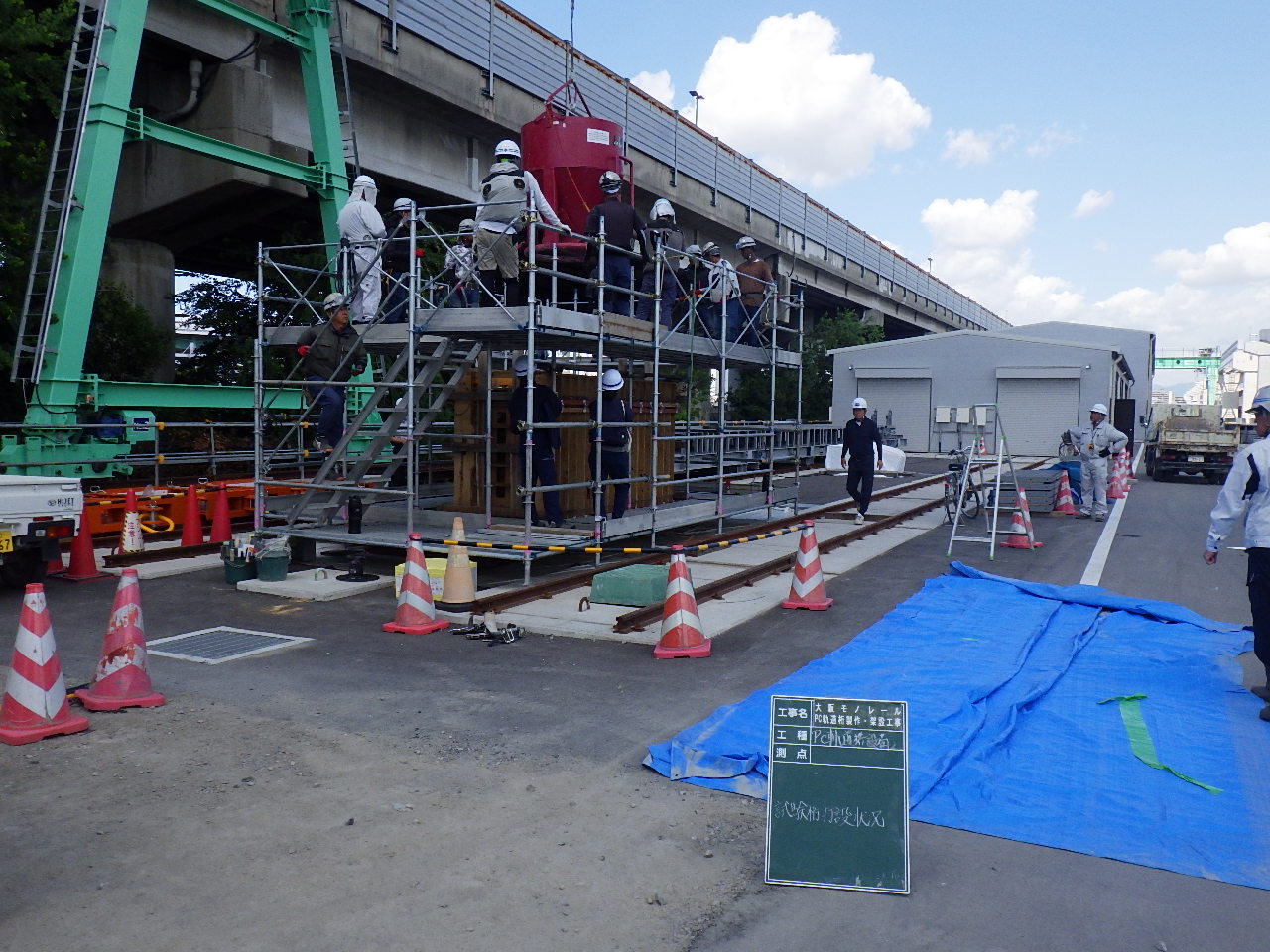 製作場内で、長さの短い試験桁を製作し、コンクリートの充填確認、